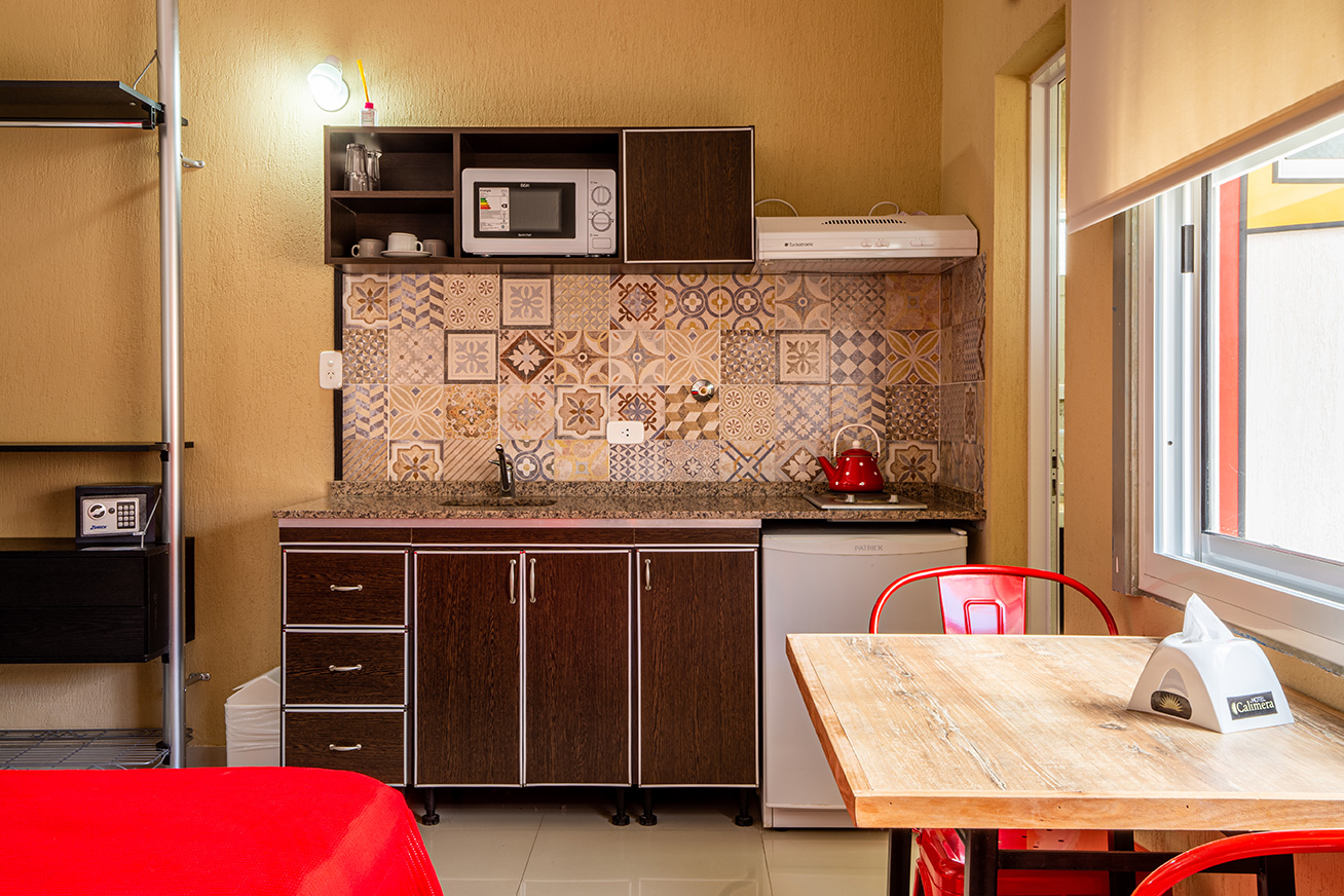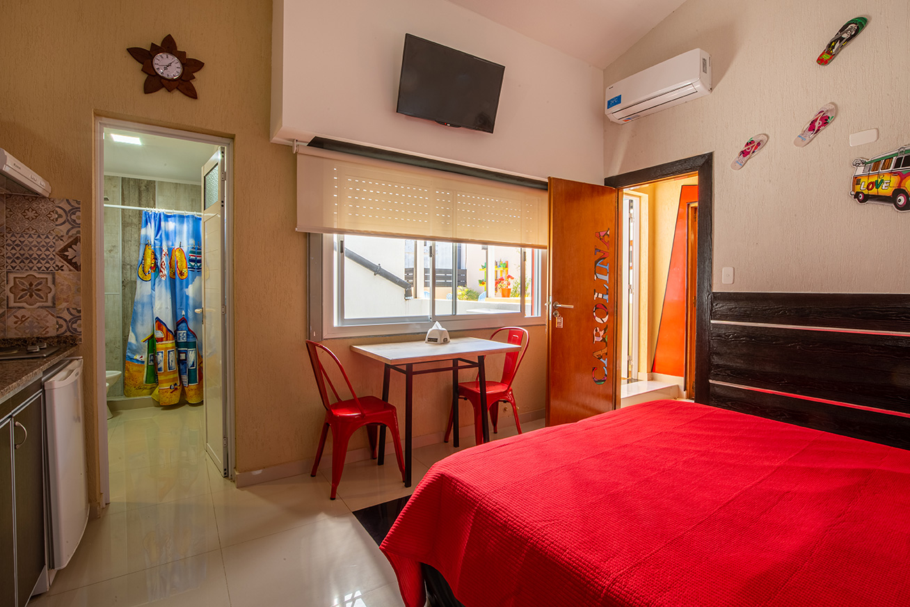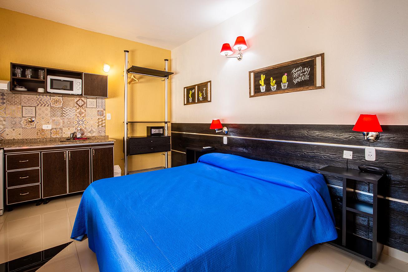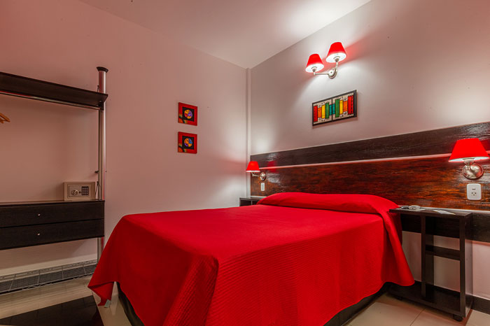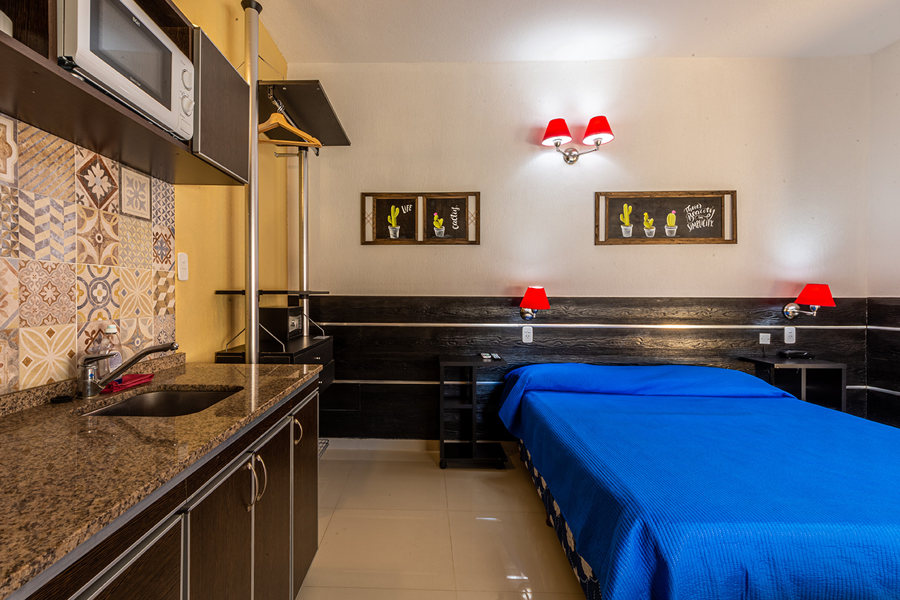 El departamento doble del Hotel Calimera cuenta con todas las comodidades y facilidades para un perfecto descanso. En sus amplios ambientes, dispone una cama sommier matrimonial, cuarto de baño con ducha, aire acondicionado, cocina completa, heladera, microondas y vajilla, televisor LED 32’, calefacción, teléfono, caja de seguridad, servicio a la habitación y Wi-Fi.